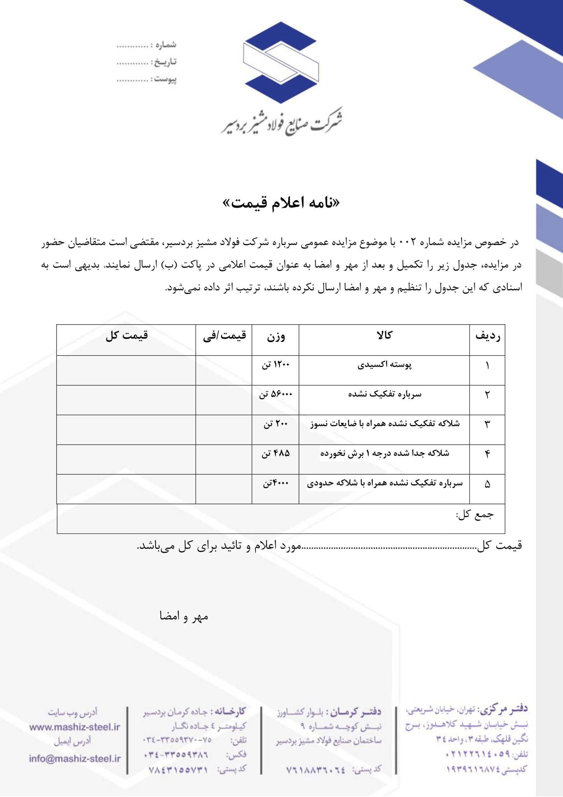 آگهي مزايده عمومي سرباره شرکت صنایع فولاد مشیز بردسیر