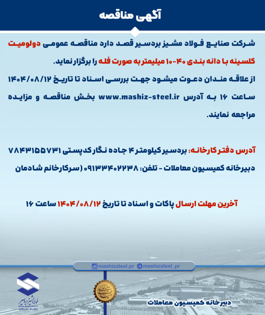 مناقصه عمومی دولومیت کلسینه با دانه‌بندی 40-10 میلیمتر به صورت فله